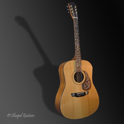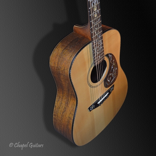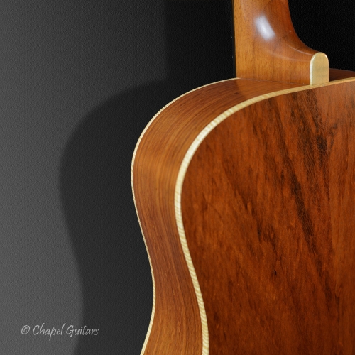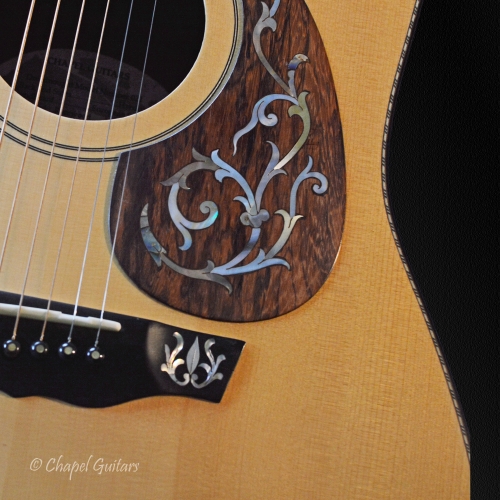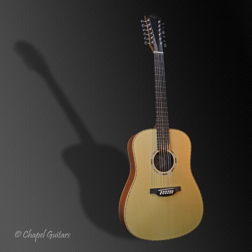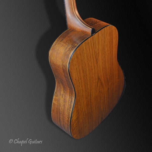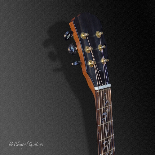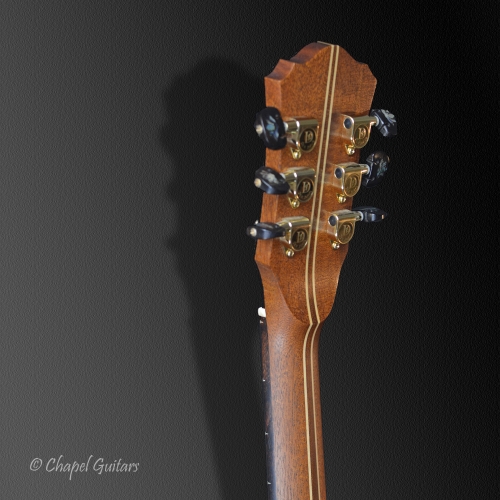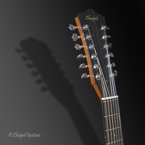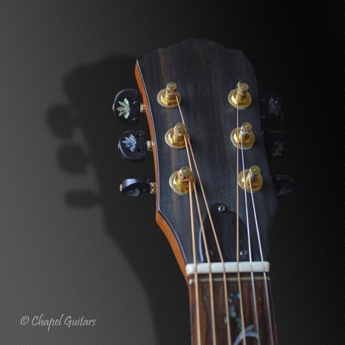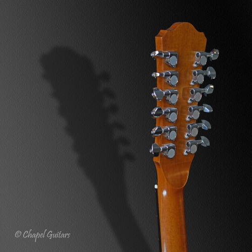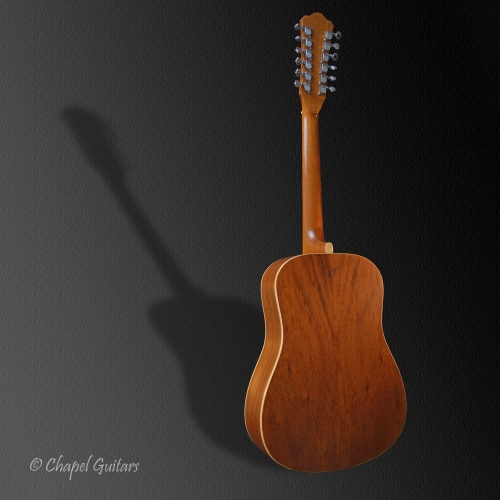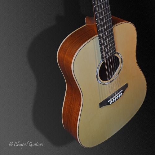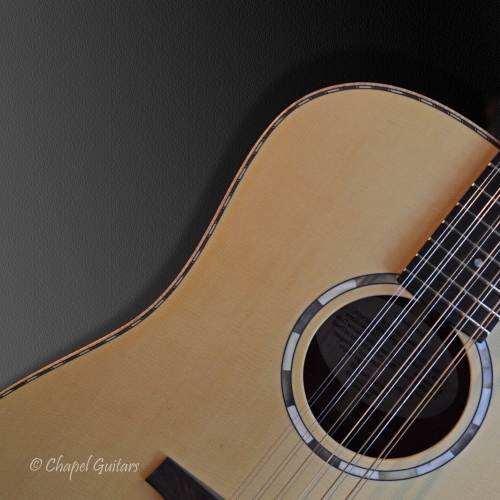 The combination of an Engelmann Spruce front, and back and sides of Goncalo Alves works particularly well on this twelve string version of the Harwood. The tone is particularly bright with tremendous sustain and the body size is large enough to produce a strong bottom end sound to balance up all that treble. It is important when building a twelve string to bear in mind that the extra strings are all increasing the treble sound of the instrument so you do need to make sure that you have a body size capable of delivering strong bass. All of my larger body sizes can be used to make a twelve string.