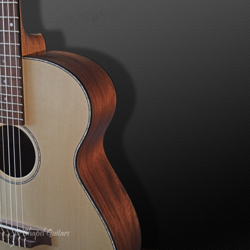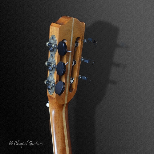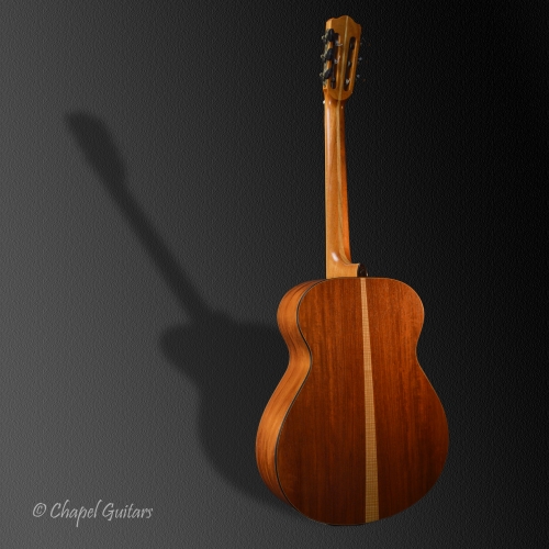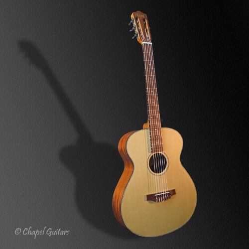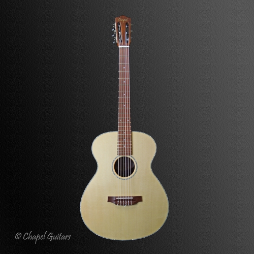 This guitar was produced in response to a number of requests from electric and steel strung acoustic players who occasionally want a nylon string sound but because a classical guitar has a very different neck it can be difficult to adapt. This hybrid feels much more like a steel strung guitar with the fingerboard only slightly wider than a steel strung acoustic and with 14 frets to the body. Fitted with a Headway HE4/FEQ undersaddle pickup it makes the transition from electric/acoustic to nylon much easier.